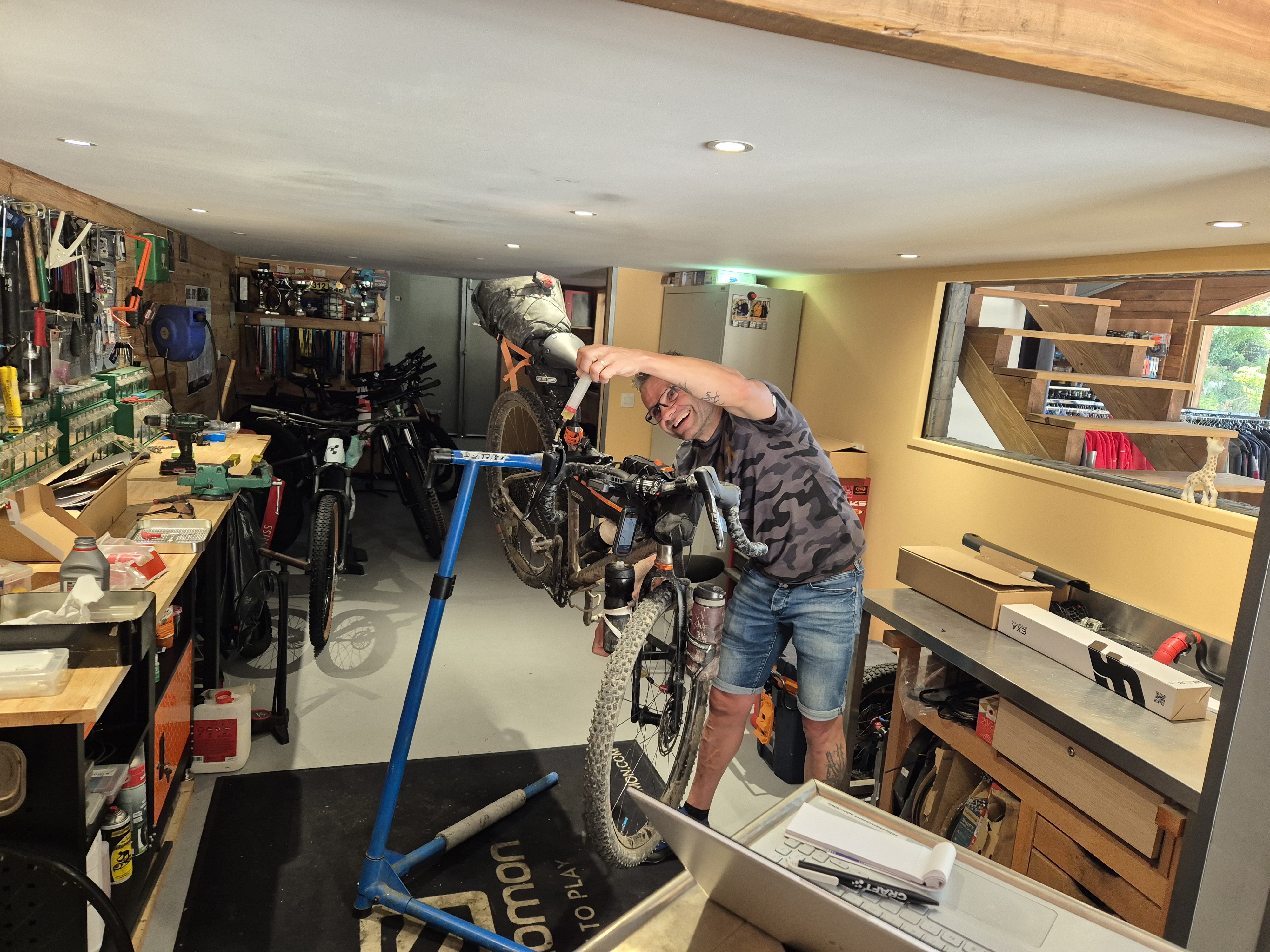 With the first climb of the day done, we descended into La Bollene Vesubie for breakfast, where we bumped into Martin. I'd played a small game at the start where I tried to spot anyone older or fatter than me. I'd already bumped into a plump dutchman, and at breakfast, there was 67 year old Martin from Worksop munching fresh croissants. With another resupply needed, we headed to Carrefour, where Kate went shopping whilst I tried some maintenance on my failing front brake. Just seconds later, I'd managed to transform a working but noisy brake into a mere deadweight by somehow emptying all of my brake fluid. Still, we are ultras, and this sort of set-back is welcome as it confirms our hard-core credentials! I'm not ashamed to admit I was super-relieved to stumble on one of the finest and nicest bike mechanics in France in St Martin Vesubie, who put it right.